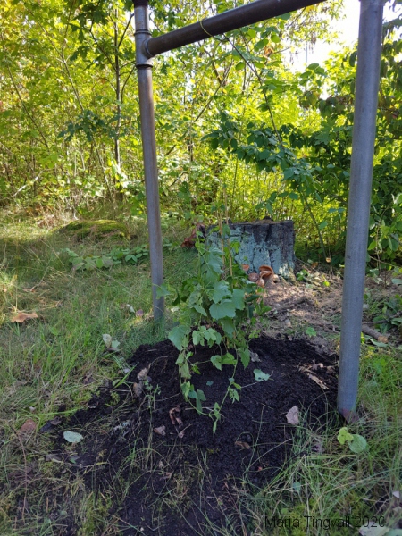 När jag fyllde år fick jag humleplantor av Jonas. Vi kollade runt en massa på svenska, engelska och tyska sidor. Det finns ju hur mycket sorter som helst som kan trivas här! Eftersom det var ”min” humle bestämde jag att vi ska börja med humle som skulle kunna ligga nära traditionell svensk humle. Det är inte så lätt att hitta svensk humle på marknaden. Det fick bli den humle som sägs passa bäst i brygder och som vi kunde köpa på handelsträdgården på andra sidan vägen: Humulus lupulus ’Nordbrau’. Nu har vi äntligen kommit till skott, fått hem den och planterat! Att hitta ett bra läge var inte så lätt heller, vi hade en massa idéer men de får åtminstone till att börja med stå vid en ställning som vi aldrig använt.